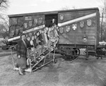 Brownies Troop 96 at souvenir boxcar, part of the French "Gratitude Gifts" exhibition at Fort Worth Children's Museum, 03/21/1949