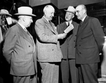 Left to right, Dr. E. M. Jellinek, Amon Carter and Dr. Charles Seymour, Yale U. president; and Dr. M. E. Sadler. The men are standing in a n office and are wearing suits and ties. Dr. Jellinek and Dr. Sadler are wearing eyeglasses. Mr. Carter has a document in his hand that he is reading while the other men look towards him. They are engaged in a conversation. In the background, there is a stand with hats on it and a framed picture hanging from the wall