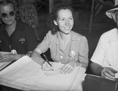 Mrs. Betty Fisher of San Antonio, Texas, secretary of the Southwest Gas Model Association, attending the Model Airplane Association show.