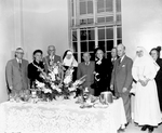 Mr. and Mrs. Amon Carter with groups at St. Joseph's Hospital. Mr. Carter in a group picture with unidentified people, there are some women in nun outfits while others are in suit jackets with skirts and berets, and the men are wearing suits and ties. They are standing behind a rectangular table with a flower center piece, cups , and drinks on it. In the background, there is a window with blinds.