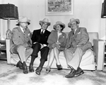 Amon Carter , Howard C. Sheperd, New York banker, and unidentified couple. They are seated on a couch The men are wearing their suit jackets, pants, inner shirt and tie with hats while the woman is wearing the same but a skirt instead of pants. There is a side table with a lamp on each side of the sofa and a painting on the wall. Mr. Carter and the unidentified lady seem to be having a conversation and smiling while the other two men are looking straight ahead.