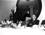 Amon Carter and group at speakers table. Amon carter and a group of men are seated at the speakers table in front of an audience. There is an unidentified man talking with the microphone as he stands amidst the men seated. The men are dressed in suits and ties. On the speakers table, there are flower decorations and glass cups with water.