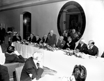 Unidentified negatives. Amon carter and a group of men are seated at the speakers table in front of an audience. There is an unidentified man talking with the microphone as he stands amidst the men seated. The speakers and the attendees are dressed in suits and ties. On the speakers table, there are flower decorations and glass cups with water.