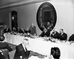 Unidentified negatives. Amon carter and a group of men are seated at the speakers table in front of an audience. There is an unidentified man talking with the microphone as he stands amidst the men seated. The speakers and the attendees are dressed in suits and ties. On the speakers table, there are flower decorations and glass cups with water.
