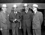 Left to right , Amon Carter, LaMotte T. Cohu, H. C. Sheperd and Floyd B. Odlum. The men are wearing suits, tie, and a hat. They are standing together and smiling as they face the camera. Mr. Sherperd is holding a purse in his hand.