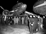 American Airlines retires its flagship airplane. At the ceremony are from under the nose of retired DC-3 (from left) are Captain Art Fox, 1st Officer Pat Preston and Stewardess Margaret Van Bibber, M. D. Miller, Amon Carter and William Holden. Under the nose of the new Convair ship are Captain Frank Haynes, William Borgers, Stewardess Dena Chapple and 1st officer Ed Schwarting. The plane crew and the other men are standing in a semi circle outdoors . The plane crew are dressed in their uniforms while the other men are wearing suits and ties with hats.