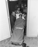Golfer Ben Hogan, on a stretcher following automobile accident near Van Horn, Texas, and hospitalization in El Paso, is helped into his home in Fort Worth.