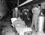 Golfer Ben Hogan, on a stretcher following automobile accident near Van Horn, Texas, and hospitalization in El Paso, is wheeled away from the train in Fort Worth; his mother Clara Hogan walks by his side.