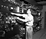 Amon Carter Junior at new presses. Star-Telegram employees in new press room. An employee of the Star-Telegram controlling some of the machinery in the press room. He is wearing a shirt and pants.