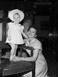 Sheila Johnson with her mother, Ruth Carter Johnson. Shelia is standing on a chair. and is wearing a short dress with a bonnet. Ruth is sitting on the floor next to her.