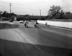 Picture of a police escort on the highway, at the presentation of a bronze plaque to the 8th Air Force. A boy is seen riding his bike on the side.