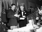 B-50. First non-stop flight around the world. Banquet for crew members at Hotel Texas. Captain James G. Gallagher, left, and Amon Carter.