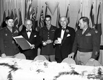 B-50. First non-stop flight around the world. Banquet for crew members at Hotel Texas. Shot of crew members, Amon Carter and generals, made after banquet.