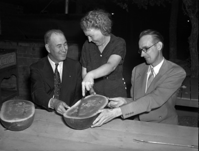 Hardin-Simmons-University alumni picnic. Mrs. De Armond Crouch, slicing watermelon for John Alvis, left, Abilene and Herschel Schooley, head of the school's journalism department.