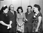 B-50. First non-stop flight around the world. Banquet for crew members at Hotel Texas. Shot of crew members, Amon Carter and generals, made after banquet.