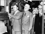 Amon Carter Jr. pushes button to start Star-Telegram's new 10-unit Gross Headliner press; from left beside Amon Jr., Amon Carter Sr., Harold V. Hough, and J.M. North, 04/17/1949