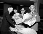 Amon Carter Sr. and Junior with newspaper employees. Showing the efficiency of the press. The employess are holding many newspapers.