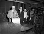Amon Carter Senior, left, looking at newspaper plate and wearing a hat made out of newspaper while a group of men look on.