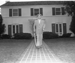 Ben Hogan recuperating from accident and walking in front of his home in Fort Worth, 04/23/1949