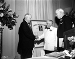 20th Annual Exchange Club's Golden Deeds Banquet, honoring Robert Ellison Harding. Amon Carter Sr. (left) is shaking Robert Ellison Harding's hand. At right is J. Lee Johnson.