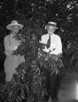 Left to right, V. M. Stevens and A. J. Ward inspecting the pecan crop at the Home for Aged Masons. Stevens is wearing a straw western-styled hat with a long sleeve shirt, suspenders, striped trousers and a pocket watch. He has a mustache. Ward is wearing a straw boater hat. He has on a long sleeve shirt, tie, and trousers. He has a mustache. Both men are inspecting a tree branch full of pecans.