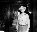 Vick Brown wearing Shady Oak Hat. Behind him is a bust statue of John Garner.