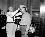 Amon G. Carter placing a hat on Vick Brown's head.