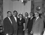 American Airlines Employees receiving 20 year pins, left to right: C. P. Hurn, J. W. Skinner, Mrs. Mamilee Puster, Captain A. R. Perkins, E. W. Martin and Captain R. S. Jones.