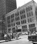 Fort Worth Star-Telegram building fire, on 7th and Taylor Streets, Fort Worth, Texas. A crowd is gathered in front of the building, watching as a firefighter climbs a ladder to the top of the building.