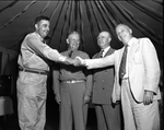 Left to right: Captain Arthur R. Beneke, Colonel Edwin McCoy, William Holden, and Web Maddox attend the Quartermaster's birthday event. Captain Beneke and Web Maddox are shaking hands. Captain Beneke and Colonel McCoy are in uniform. The other two gentlemen are dressed in suits.