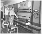 Roy Bond, assistant master control supervisor, and R.C. Stinson, director of engineering, starts first broadcast of WBAP-TV from new building at 3900 Barnett, 6 a.m., Sunday, 06/19/1949.