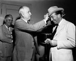 Amon Carter Sr. and Sir Hartley Shawcross trying on Shady Oak Hats.