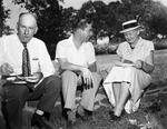 Image shows three people at Arlington State College Ex-Students Association. From left to right, President E. H. Hereford, Andy Anderson, Fort Worth and Mrs. E. H. Hereford. They are shown eating a picnic lunch and talking at a reunion of the Arlington State College Ex- Students Association, formerly NTAC Ex- Students association. Published in Fort Worth Star-Telegram morning edition July, 5 1949.