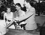 Image shows Arlington State College Ex-Students Association (ASC) reunion. From left to right, Miss Frances Ingram, Arlington, secretary-treasurer; Lee Smith, center, Dallas, vice president and James McNees, Dallas, president. They are shown holding plates in front of picnic table during event. Published in Fort Worth Star-Telegram evening edition July 5,1949.