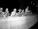 Amon Carter Senior speaks into a microphone while his wife, Minnie Carter, and others sit around him.