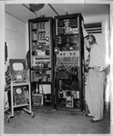 Lon C. Smith stands next to telecasting equipment used at WBAP-TV.