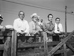 Four Mexican small farmer owners look at cattle in pens at the Fort Worth Stockyards. Left to right, there re Camila Prozco, Professor Carlos Paz y Puente, Miguel Angel Hernandez and Ignacio Miranda. Published in Fort Worth Star-Telegram evening edition September 12, 1949.