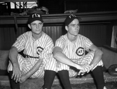 Fort Worth Cats signed two new hometown players. They are left to right, Wyman Hunnicutt and Eldon Hill. Hunnicutt is a nineteen year old third basemen. He spent a few games in the East Texas League earlier this season. Hill is an eighteen year old catcher from North Side High School. He is filling in for Norm Kies, who has a sprained ankle. They are sitting on the top step of the dugout, dressed in the Cats' home pinstripe uniform. There is a glove and catcher's gear on the railing.