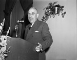 A man speaks into a microphone at the St. Joseph's Hospital Party in Texas Hotel.