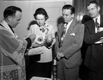 Baptism of J. Lee Johnson IV. To the left, the pastor is seen blessing the child. Mrs. Lee Johnson III is in the picture seen holding her newborn. Amon Carter Sr. is seen in the shadows behind a unidentified man to the right.