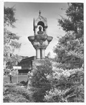 Al Hayne monument from front with candy and tobacco store in background across street, 10/30/1949