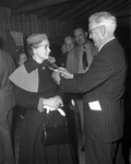 Oveta Culp Hobby, president of the Southern Newspaper Publishers Association and former WAC commander, received a welcome tag from Walter Murray, publisher of the Mineral Wells Index, as part of the Southern Newspaper Publishers Association convention held in Mineral Wells, Texas.