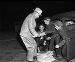 Centennial Edition. Amon G. Carter delivering copies of the Centennial Edition. Paper boys are helping Amon Carter Sr. put on rubber bands for the newpapers.