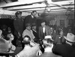 Party at Shady Oaks for Associated Press Managing Editors Association. Amon Carter Sr. standing beside men on a cart in the midst of a seated crowd in a room at Shady Oaks.