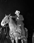 Party at Shady Oaks for Associated Press Managing Editors Association.An unidentified man on a horse. The man is dressed in suit and tie and a hat. There are other people in partial view in the background