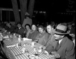 Party at Shady Oaks for Associated Press Managing Editors Association. Unidentified people seated at a table outdoors with a checkered table cloth with mugs and glass cups in front of them