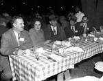 Party at Shady Oaks for Associated Press Managing Editors. Unidentified people seated at different tables outdoors with checkered table cloths. There are plates of food, mugs, and glass cups in front of them. Some people dining, having conversations, and posing for the camera. There are waiters going around assisting the guests.