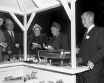 Party at Shady Oaks for Associated Press Managing Editors. Guest standing in front of a bar conversing with glass cups and a food dish in front of them