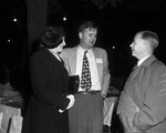 Party at Shady Oaks for Associated Press Managing Editors. Two unidentified men and an unidentified woman dressed in suits having a conversation. They are standing outdoors