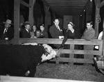 Northwoods Farm. Party for Associated Press Managing Editors. They are in a barn with mulitiple animals. In the picture a women is seen feeding a cow.